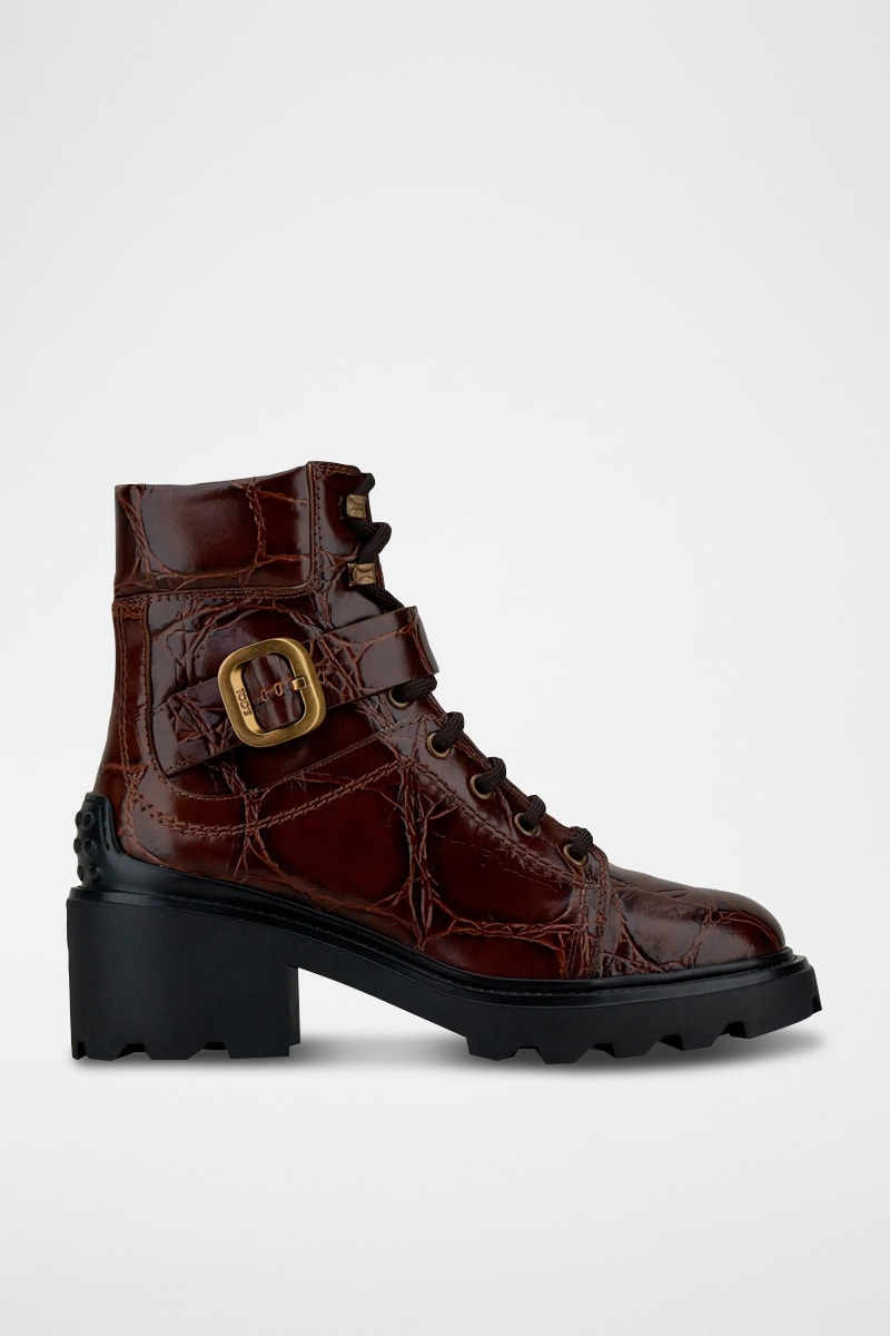 Cierre de cordones y cremallera y tira con hebilla en el lateral.