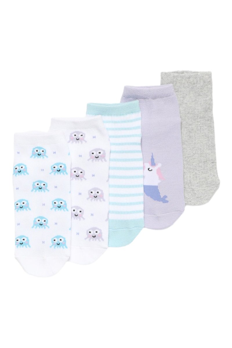 5 pares de calcetines, 2 de ellos con estampado de fantasía, 1 con estampado de rayas y 1 con estampado de fantasía delante.
