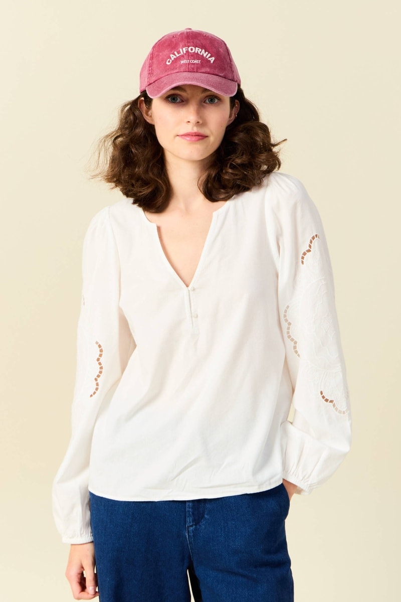 Blusa de manga larga elástica con estampado de fantasía bordado y galones.