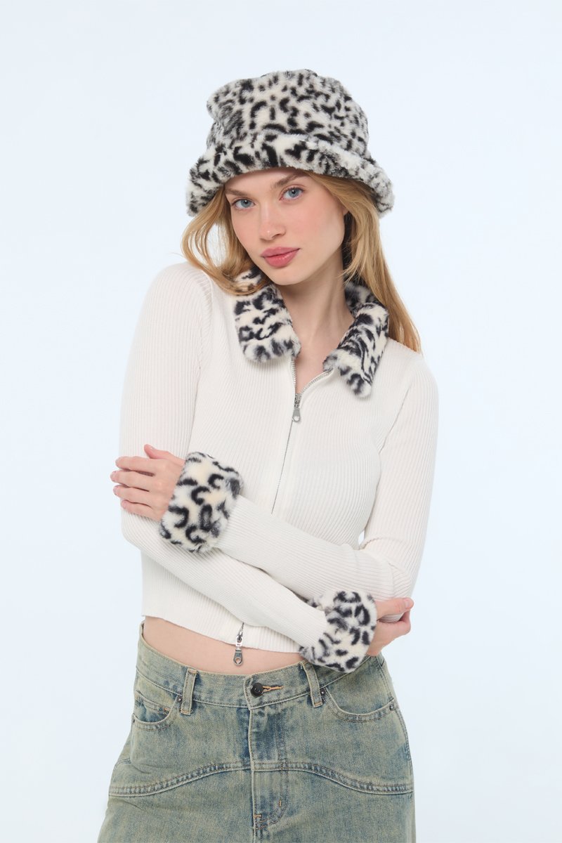 Detalles de pelo sintético con estampado de leopardo en el cuello y las mangas.