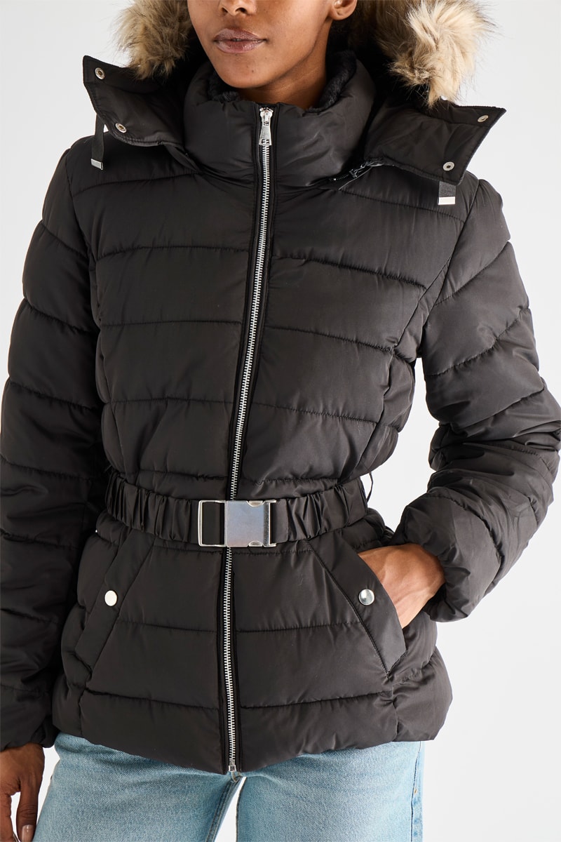 Anorak con capucha extraíble de pelo sintético y tiras de ajuste.