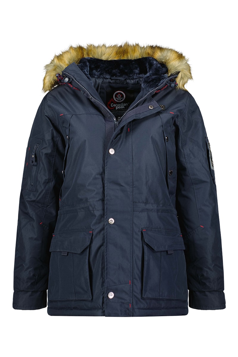 Parka con capucha con pelo sintético extraíble y tira ajustable.