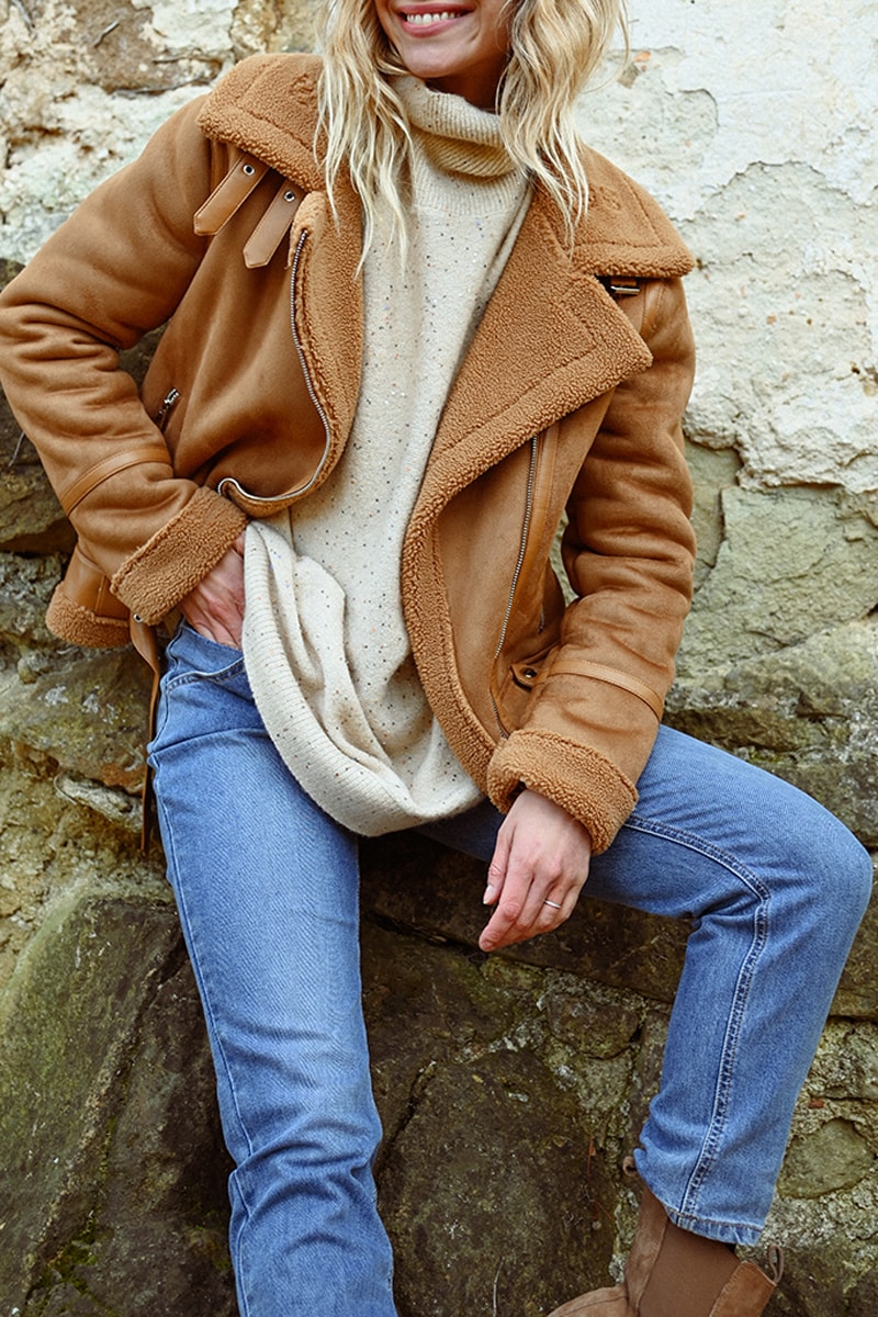 Detalles de pelo sintético en el cuello, la manga y el bajo.