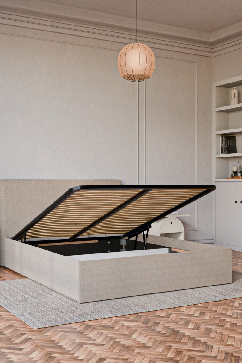 Fabricado en Europa, combina calidad de alta gama y practicidad, gracias a un amplio espacio de almacenamiento bajo el somier y un mecanismo de apertura fácil y seguro.