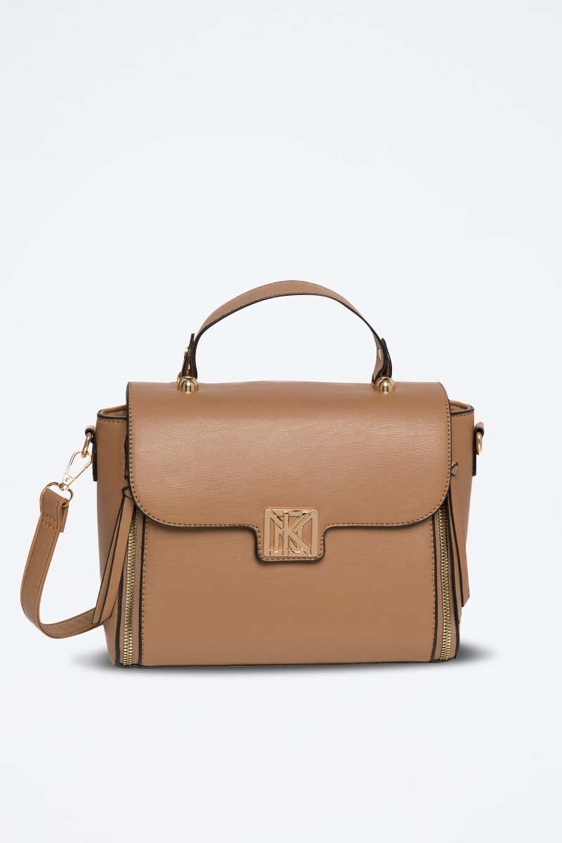 Bolsillo con cremallera y detalle de metal con logo detrás.