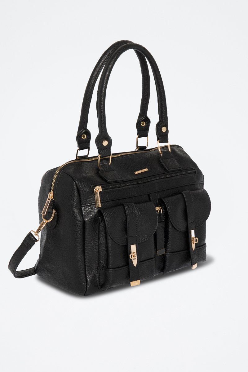 Bolsillo exterior con cremallera, 2 compartimentos exteriores con solapa y tiras, tira con hebilla y placa metálica con logo delante.