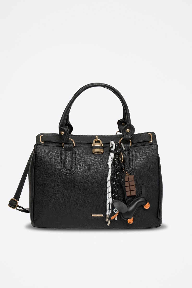 Detalle de metal con logo, candado, llaveros, cordones y tiras extraíbles delante.
