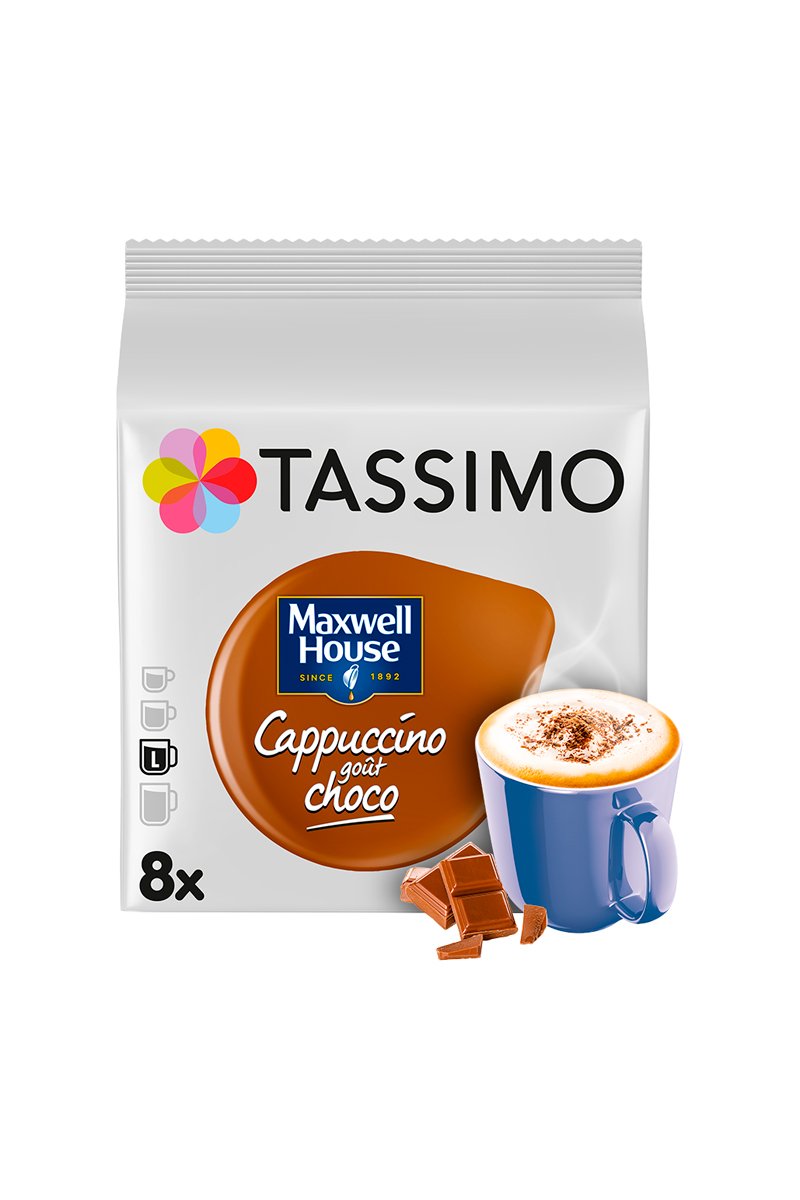 Tassimo Maxwell House Cappuccino Choco, todo el placer de un capuchino generoso con sabor a chocolate bajo una espuma cremosa.
