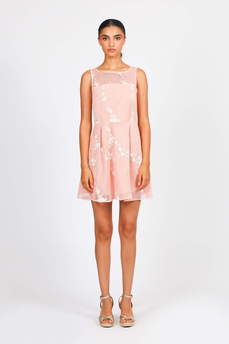 Vestido evasé de gasa bordada.
