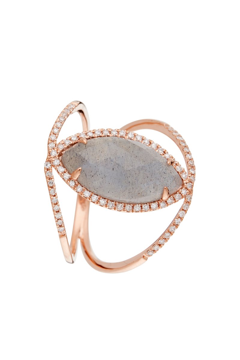 Anillo de oro rosa con 74 diamantes y una labradorita.