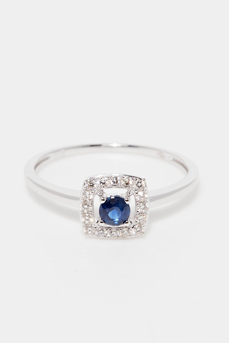 Anillo de oro blanco con 16 diamantes y un zafiro.