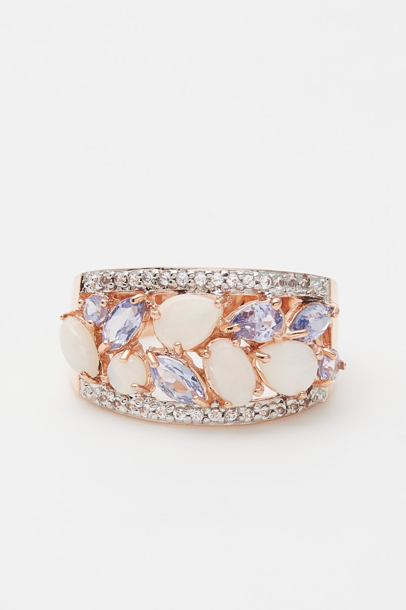 Anillo de oro rosa con 5 ópalos, 28 topacios y 6 tanzanitas.