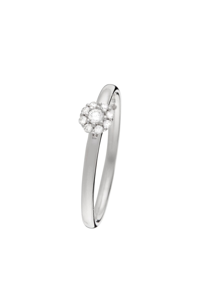 Anillo de oro blanco con 9 diamantes, 1 de ellos solitario.