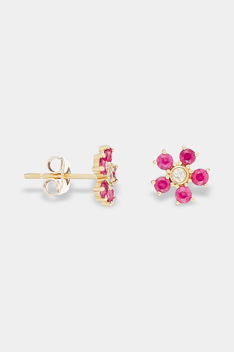 Dormilonas de oro amarillo con un diamante y 5 rubíes.