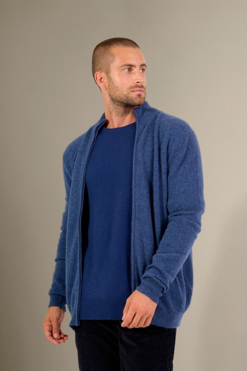 Cárdigan 100 % cachemir - Cuello alto - Azul jaspeado