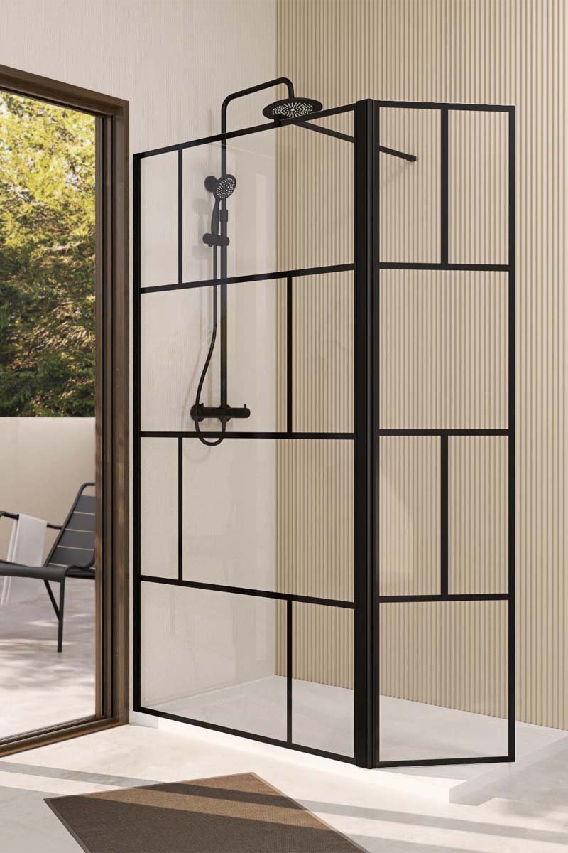 Añade un toque gráfico en tu cuarto de baño gracias a la mampara de ducha antical Dark Blocks.