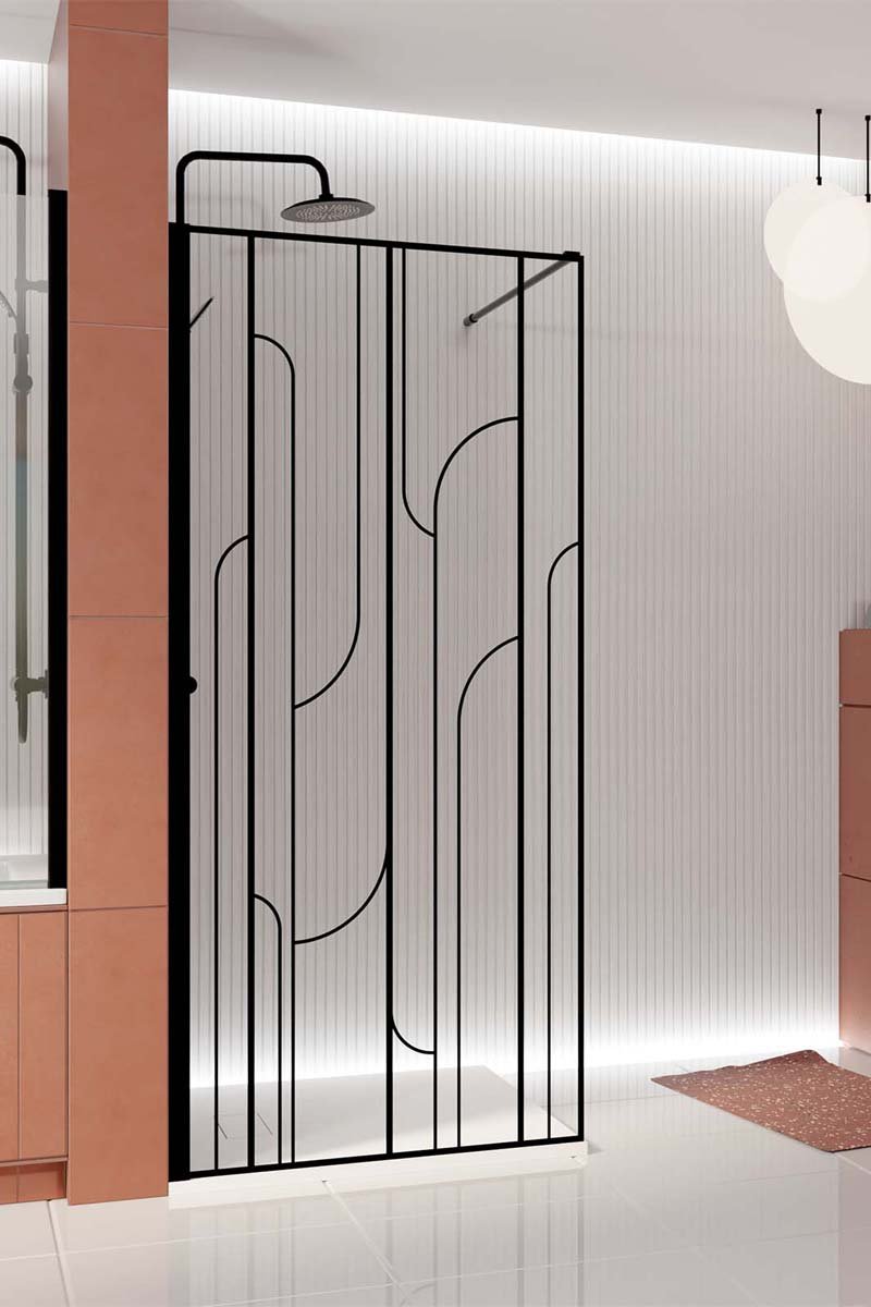 Descubre la elegancia atemporal de esta mampara con estilo Art Déco, acabado negro mate, imaginada como la unión perfecta entre lo vintage y la sofisticación moderna. Esta mampara de ducha italiana aportará una atmósfera lujosa y artística a tu cuarto de baño.