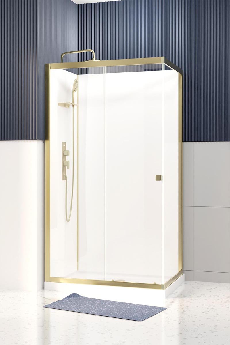 Aporta un toque de refinamiento en tu cuarto de baño con la cabina de ducha con tonos dorados y blancos.
