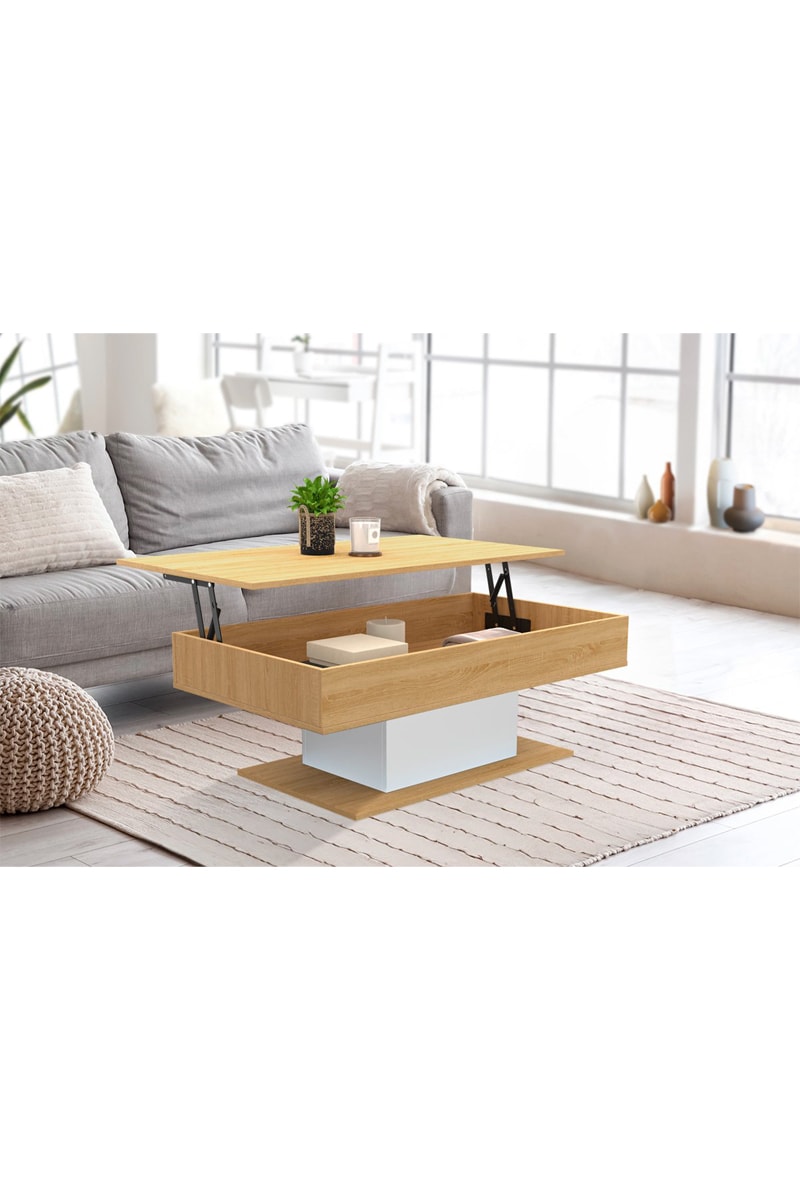 Mesa de centro con tablero elevable - imitación madera y blanco