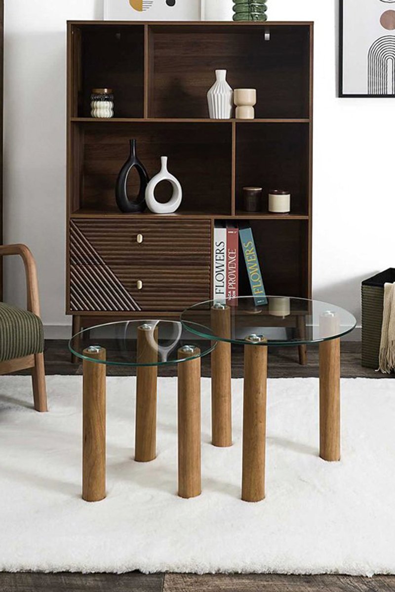 2 mesas de centro encajables de vidrio y madera de caucho Clara - 50 x 43 x 50/40 x 40 x 40 cm