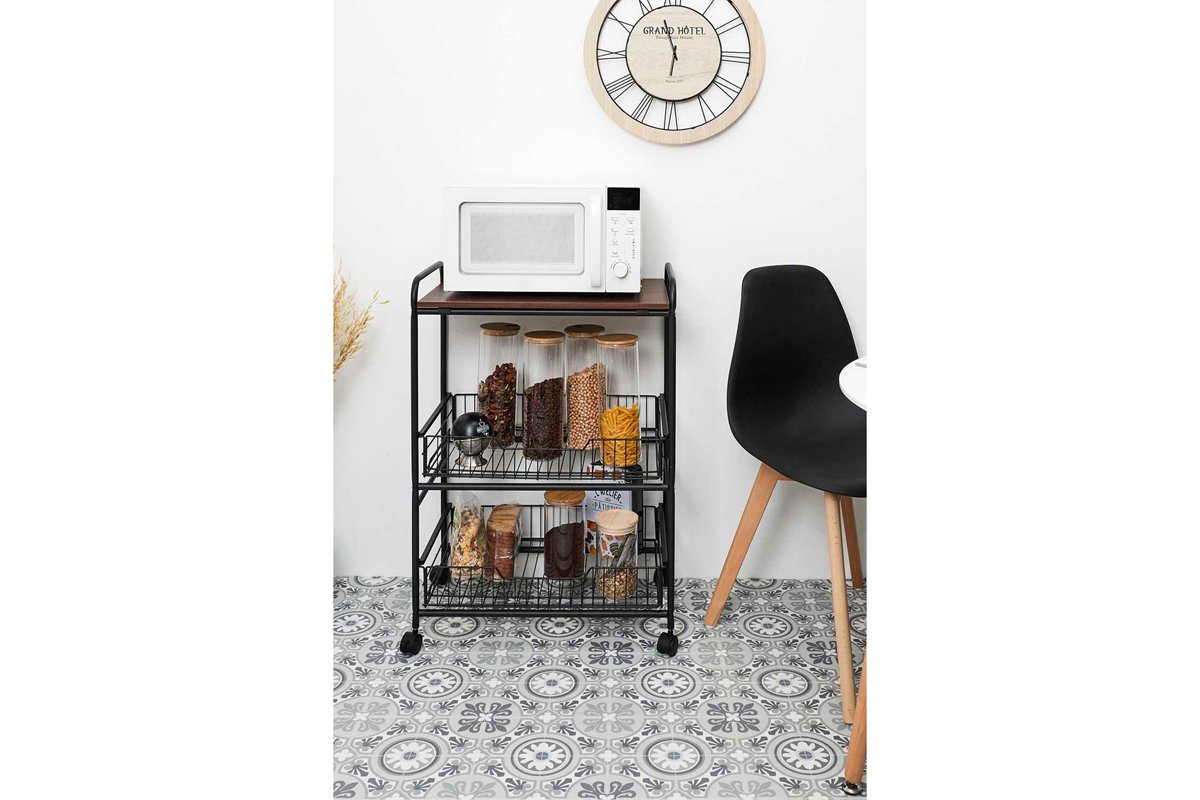 Mesa auxiliar con ruedas, estante y 2 cajones - Negro