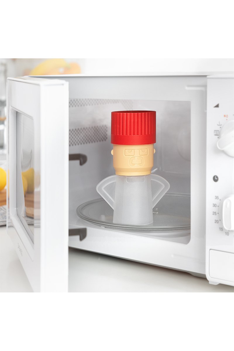 Llenar el limpiador con 60 ml de agua y 60 ml de vinagre y colocarlo en el microondas entre 5 y 8 minutos a potencia máxima.