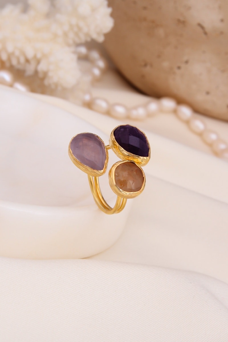 Anillo ajustable chapado en oro amarillo con un citrino, un cuarzo y una amatista.