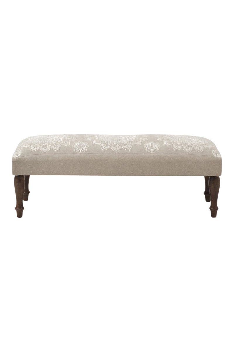 Puf tapizado de tela de algodón chambray con bordados y relleno de poliéster, viscosa y algodón.