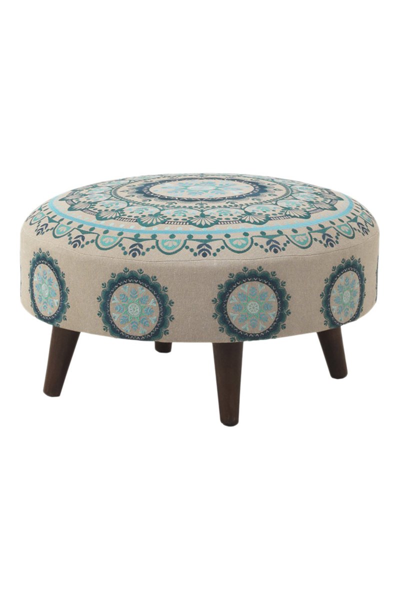 Puf tapizado de tela de algodón chambray con bordados y relleno de poliéster, viscosa y algodón.