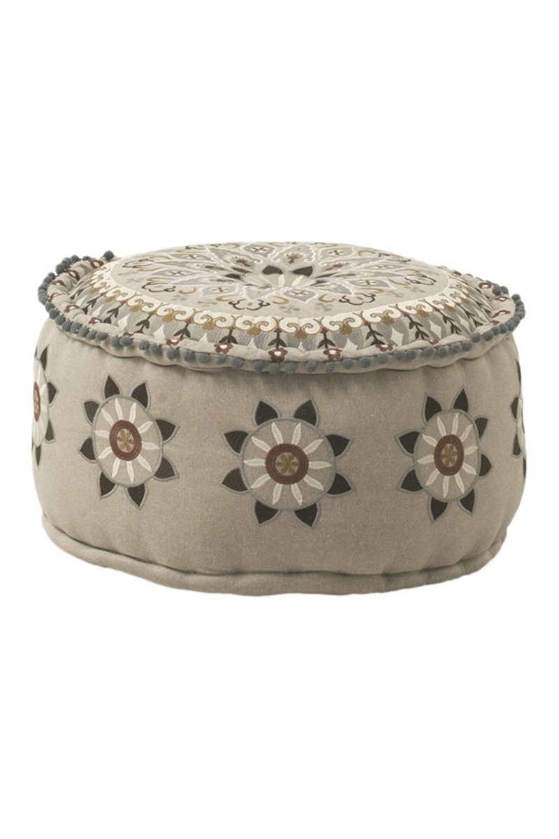Puf tapizado de tela de algodón chambray con bordados y relleno de poliéster, viscosa y algodón.