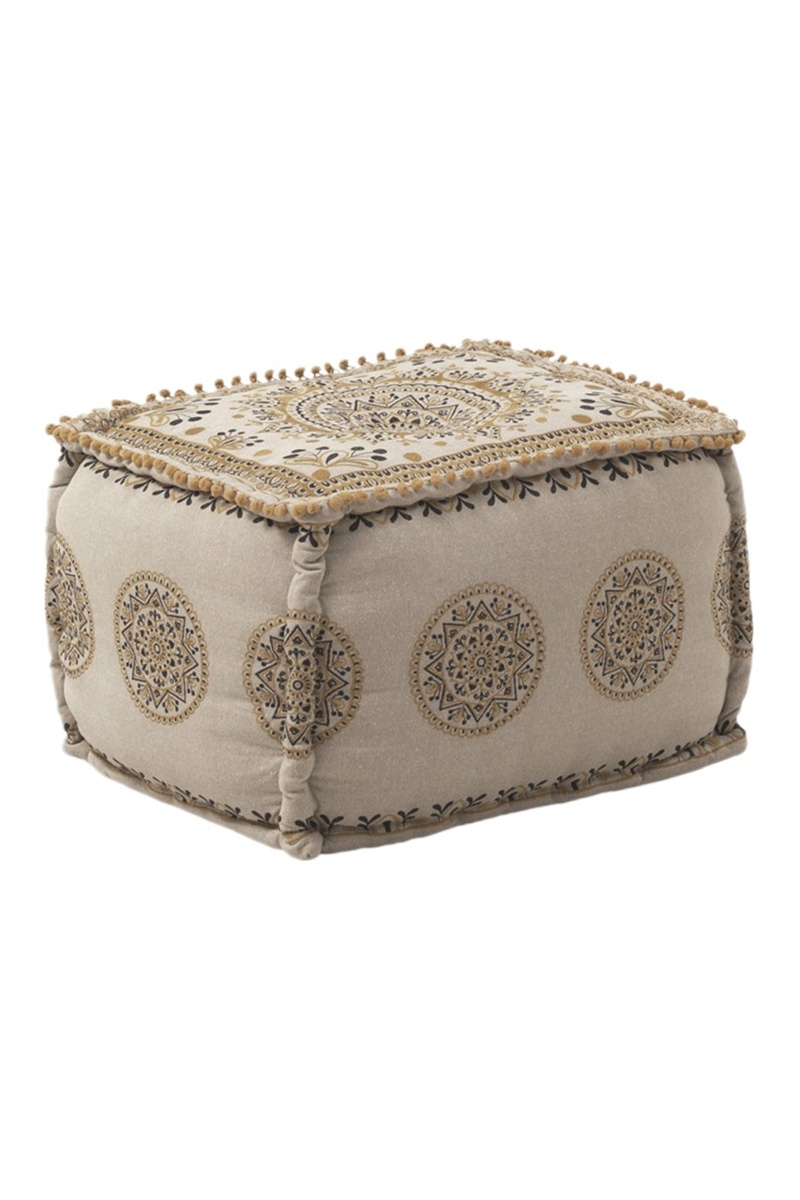 Puf tapizado de tela de algodón chambray con bordados y relleno de poliéster, viscosa y algodón.