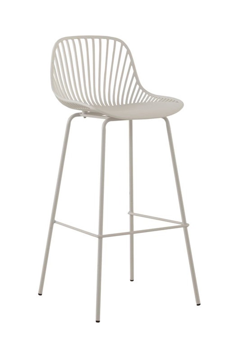 2 taburetes de polipropileno de color verde blanquecino con patas de metal del mismo tono.