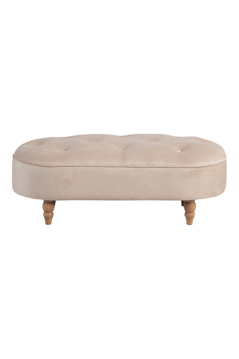 De forma redonda, la banqueta Balai con terciopelo beige capitoné y patas de madera posee un estilo neoclásico.