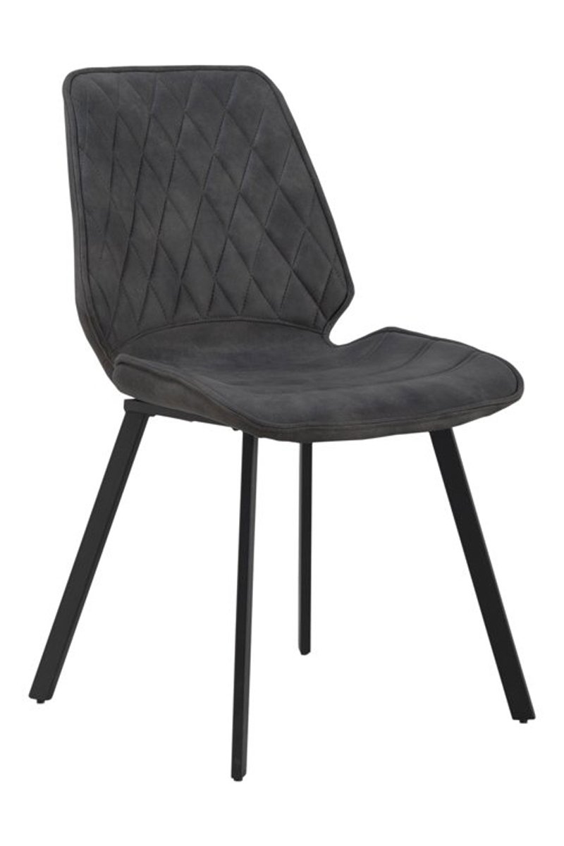 2 sillas tapizadas de color gris oscuro con patas de metal negro.