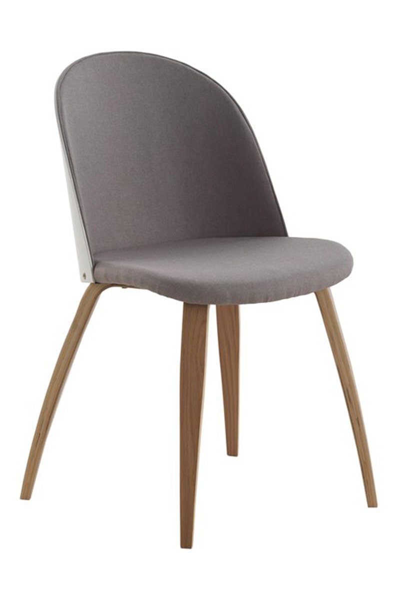 2 sillas tapizadas de color lino con respaldo blanco lacado y patas de roble natural.