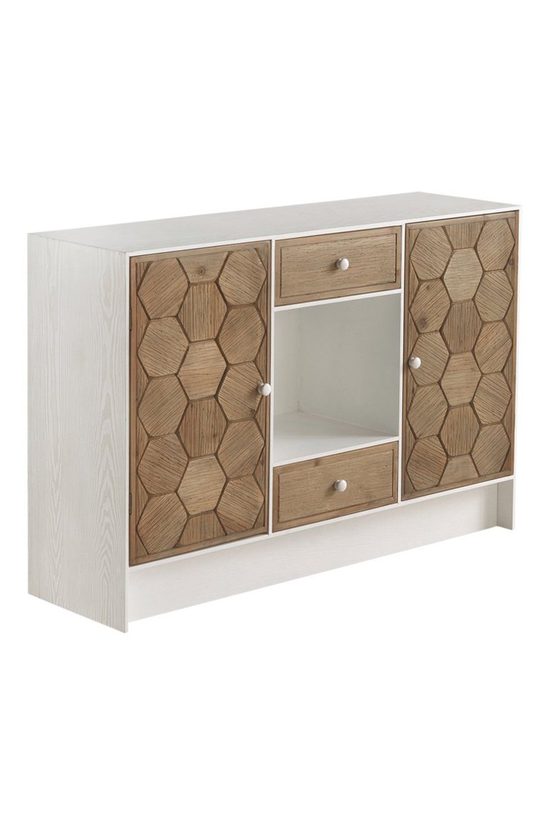 Aparador de tono natural de pino y fresno con pintura blanca.