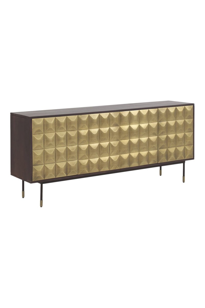 Este aparador de 4 puertas está fabricado con mango macizo, con un frontal recubierto de metal dorado.