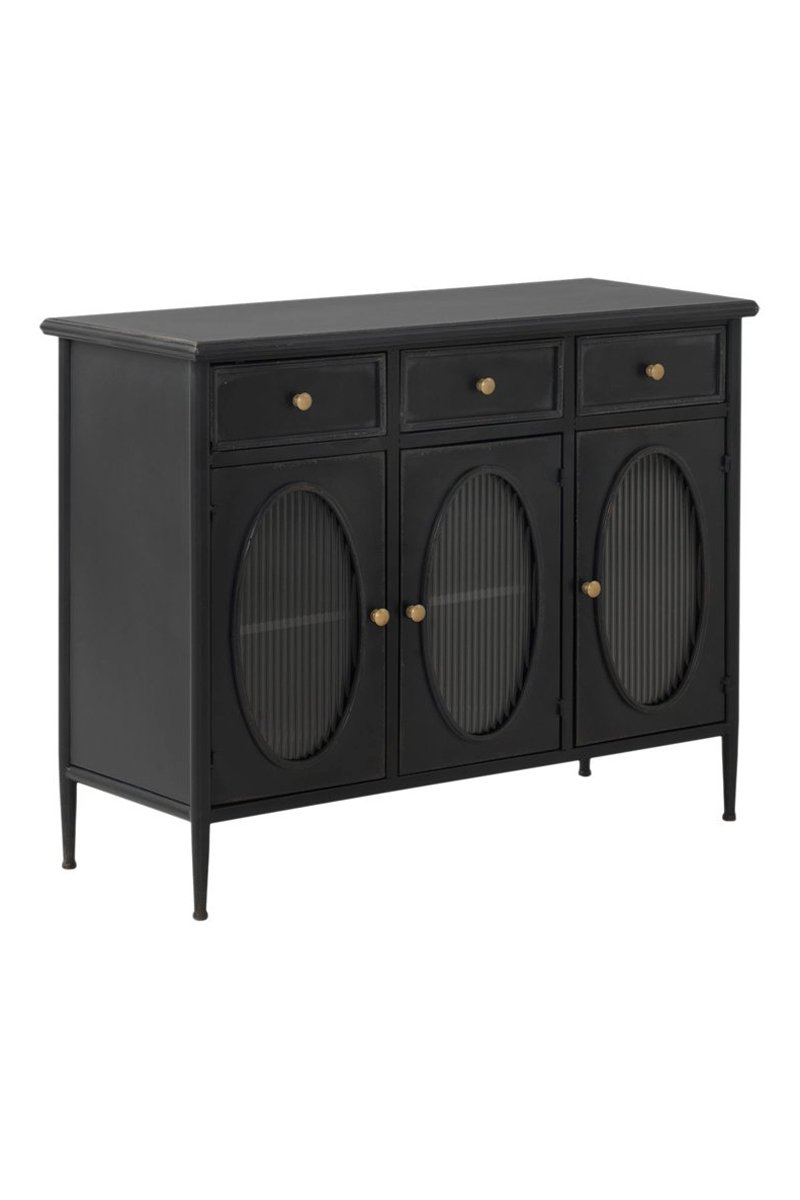 Aparador con estructura metálica, puertas ovaladas y tres cajones.