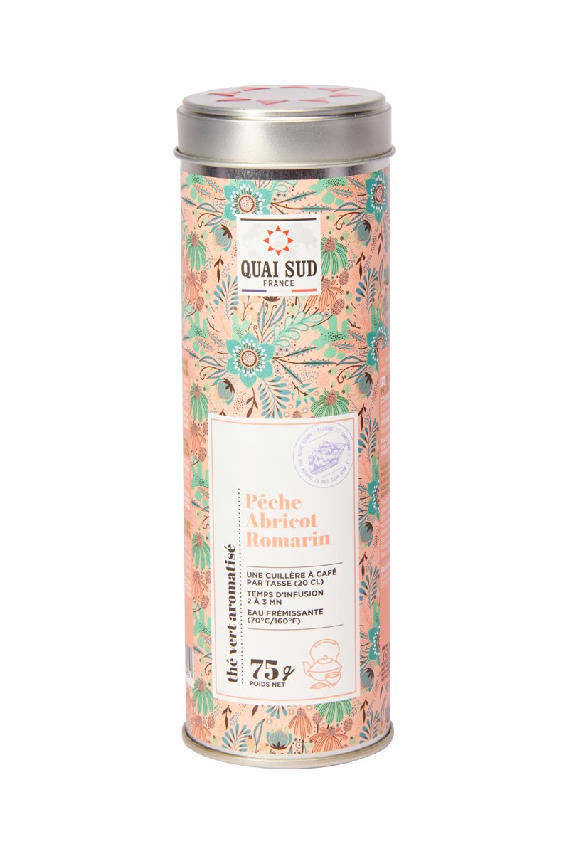 Ingredientes: té verde 90 % (no UE), aroma (melocotón-albaricoque) 4,5 %, trozos de melocotones 2,7 %, romero 2,7 %.