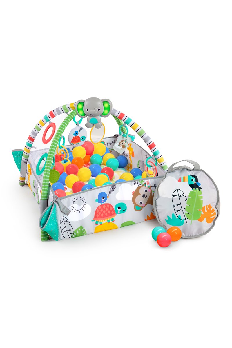 Se pueden levantar los bordes de la alfombra para crear un espacio de juego cerrado donde divertirse con las 40 bolas de colores.
