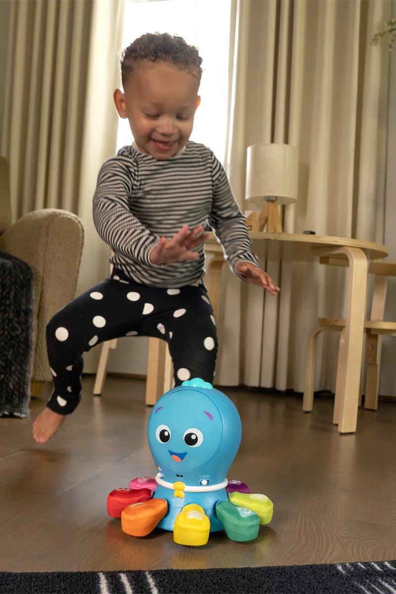 Opus se ilumina, gira y se mueve cuando el bebé presiona el brazo suave en modo de juego boca abajo.