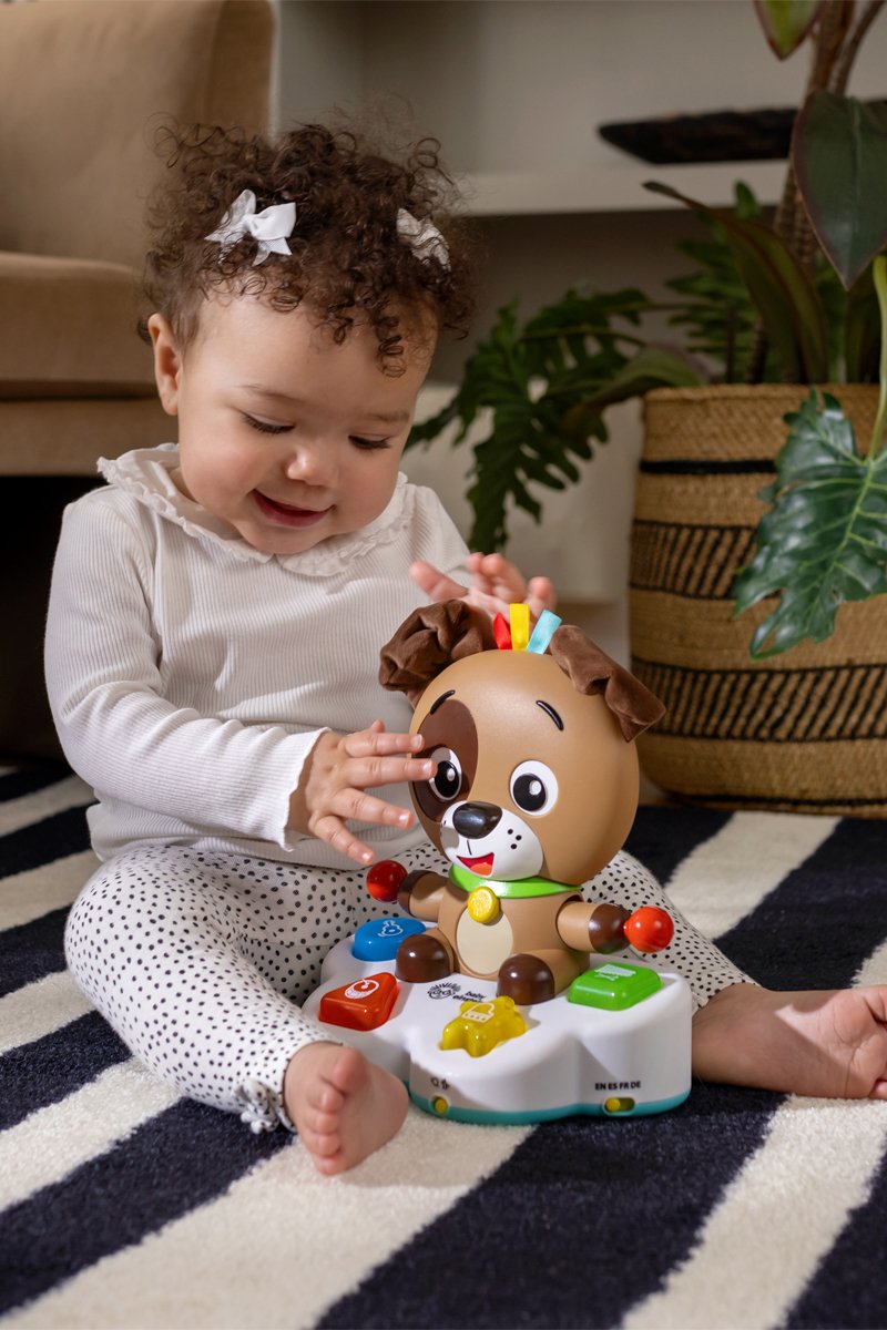 Tu bebé tiene que apretar la cabeza de Dean para mover sus brazos de arriba a abajo e iluminar su nariz, aprender la causa-efecto y desarrollar las capacidades motoras finas.