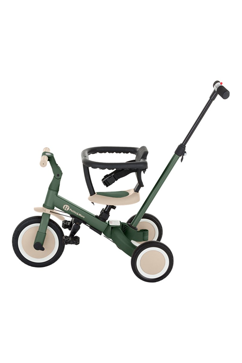 Triciclo con posibilidad de ayuda parental y bicicleta estándar con pedales, sin elementos de sujeción adicionales.