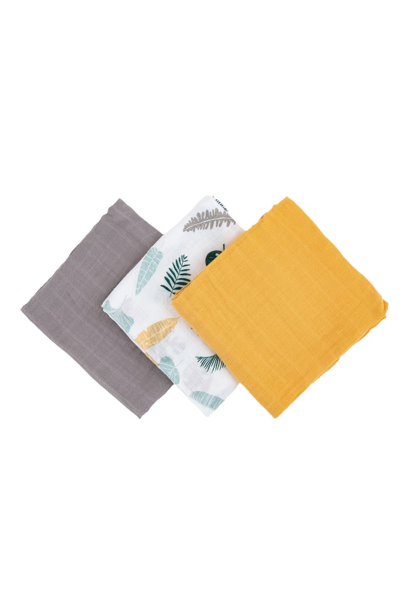 3 muselinas de fibras de bambú, 1 de ellas con estampado de hojas.