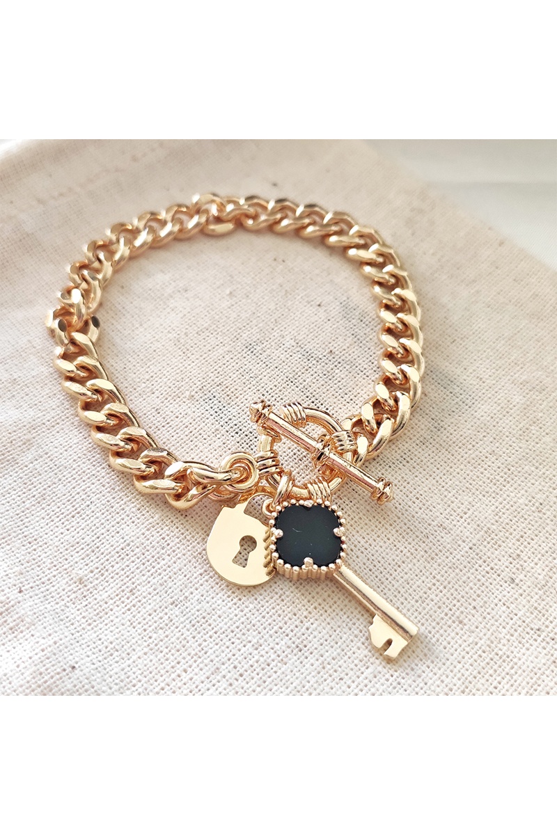 Ríndete ante la belleza atemporal de esta pulsera. La piedra nacarada negra, junto con el colgante de llave y candado, evoca un sentimiento de misterio y seducción.