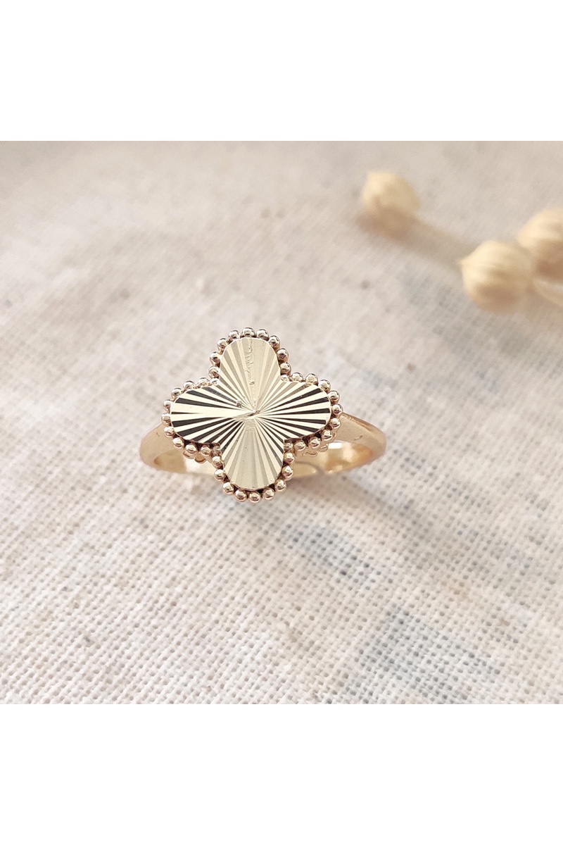 Enamórate de este anillo ajustable con un trébol chapado en oro. Un símbolo de suerte y felicidad que realza tu estilo.