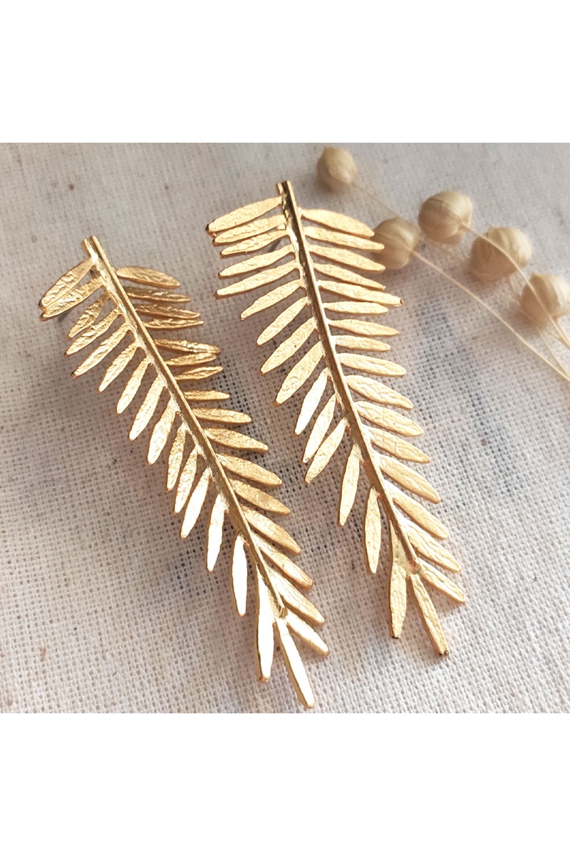 Elige estos pendientes largos de latón chapado en oro con forma de hoja. Ideales para un look casual o elegante.
