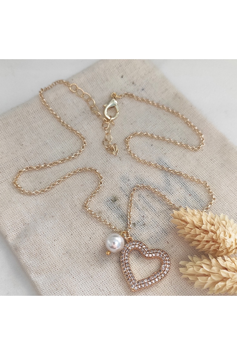 Collar con colgante de corazón - Latón bañado, chapado en oro, perlas y piedras de circón