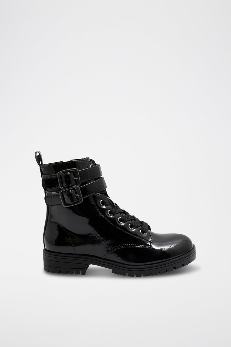 Cierre de cordones y de tiras con hebilla delante, de cremallera y velcro en el lateral.