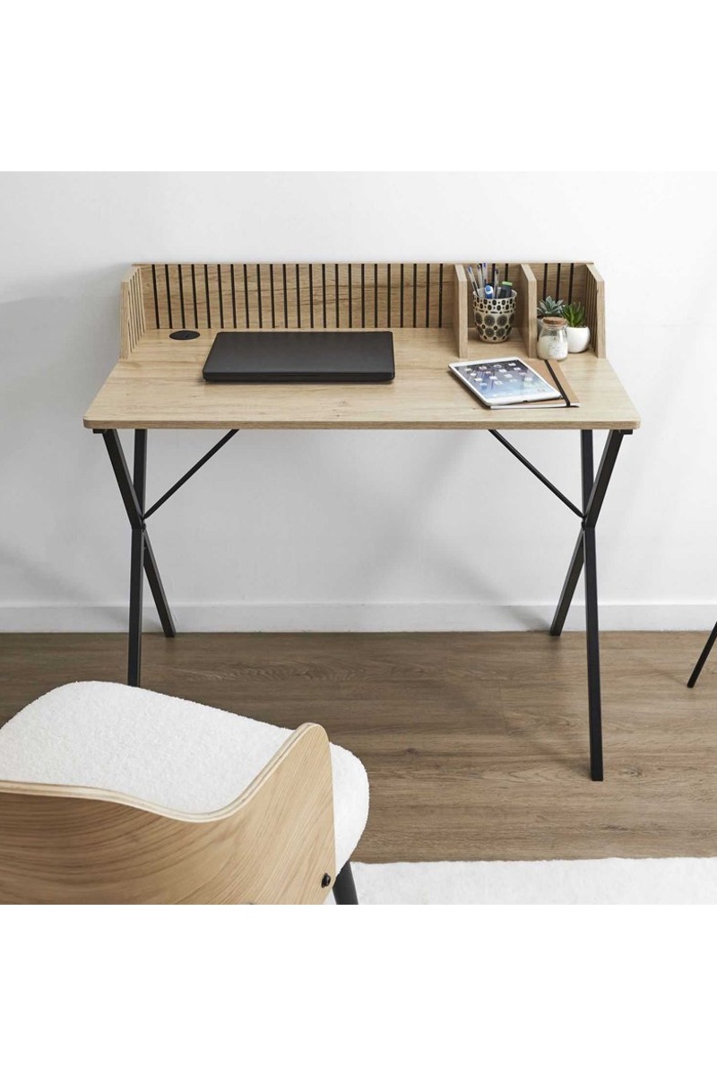 Sus líneas cuidadas y sus patas de metal aportan un toque moderno a cualquier espacio de trabajo.